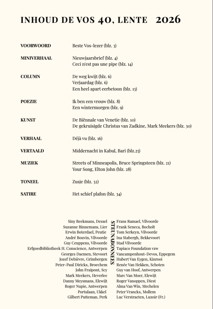 Het nieuwe nummer van De Vos, zowel op papier als digitaal hebben wij goed ontvangen. Weer mooi gedaan en met heelwat interessant lees – kijk – en luisterplezier. Dankjewel voor al dat moois waar je weer zoveel tijd en energie aan besteed hebt! Ina Stabergh